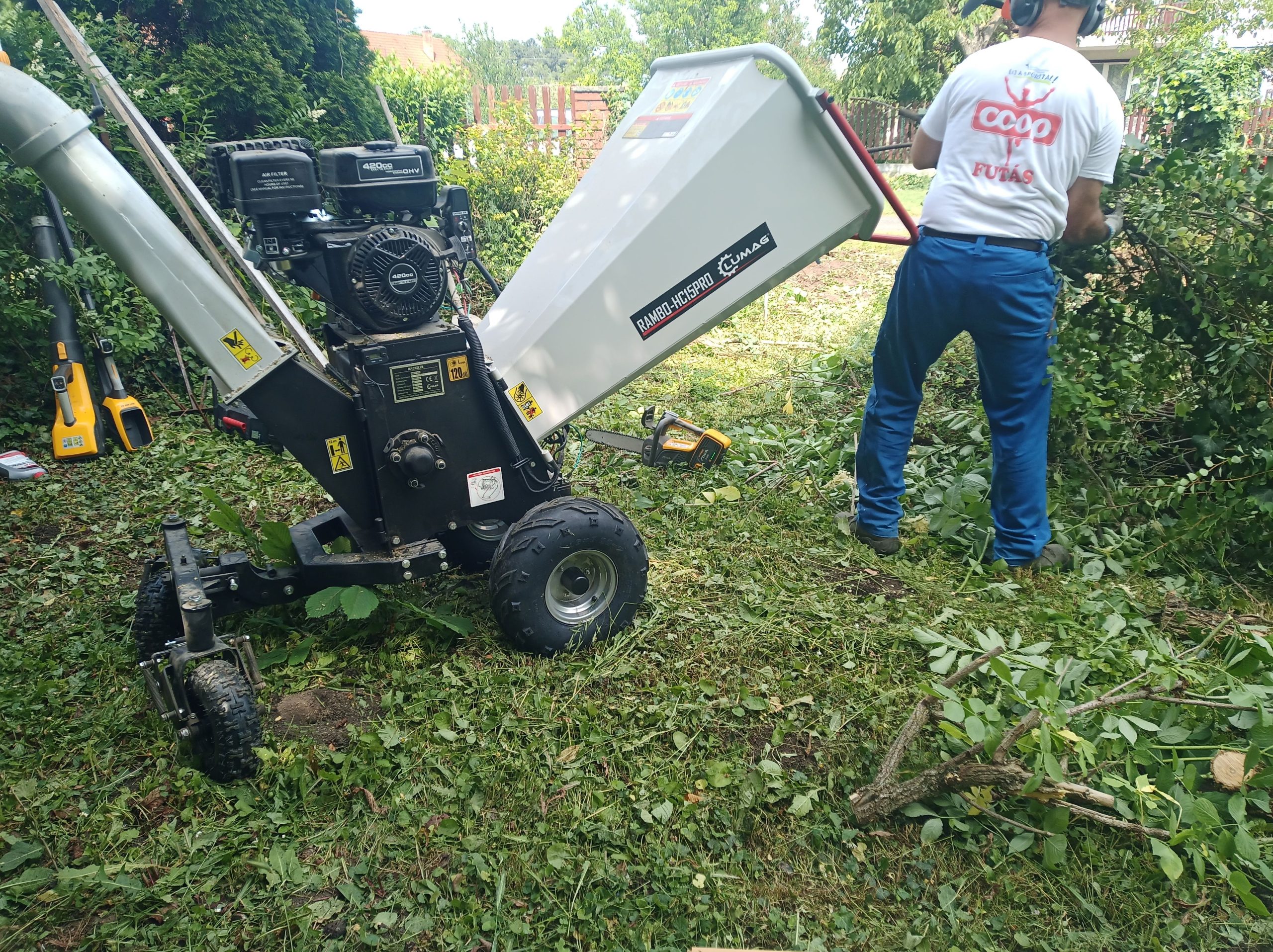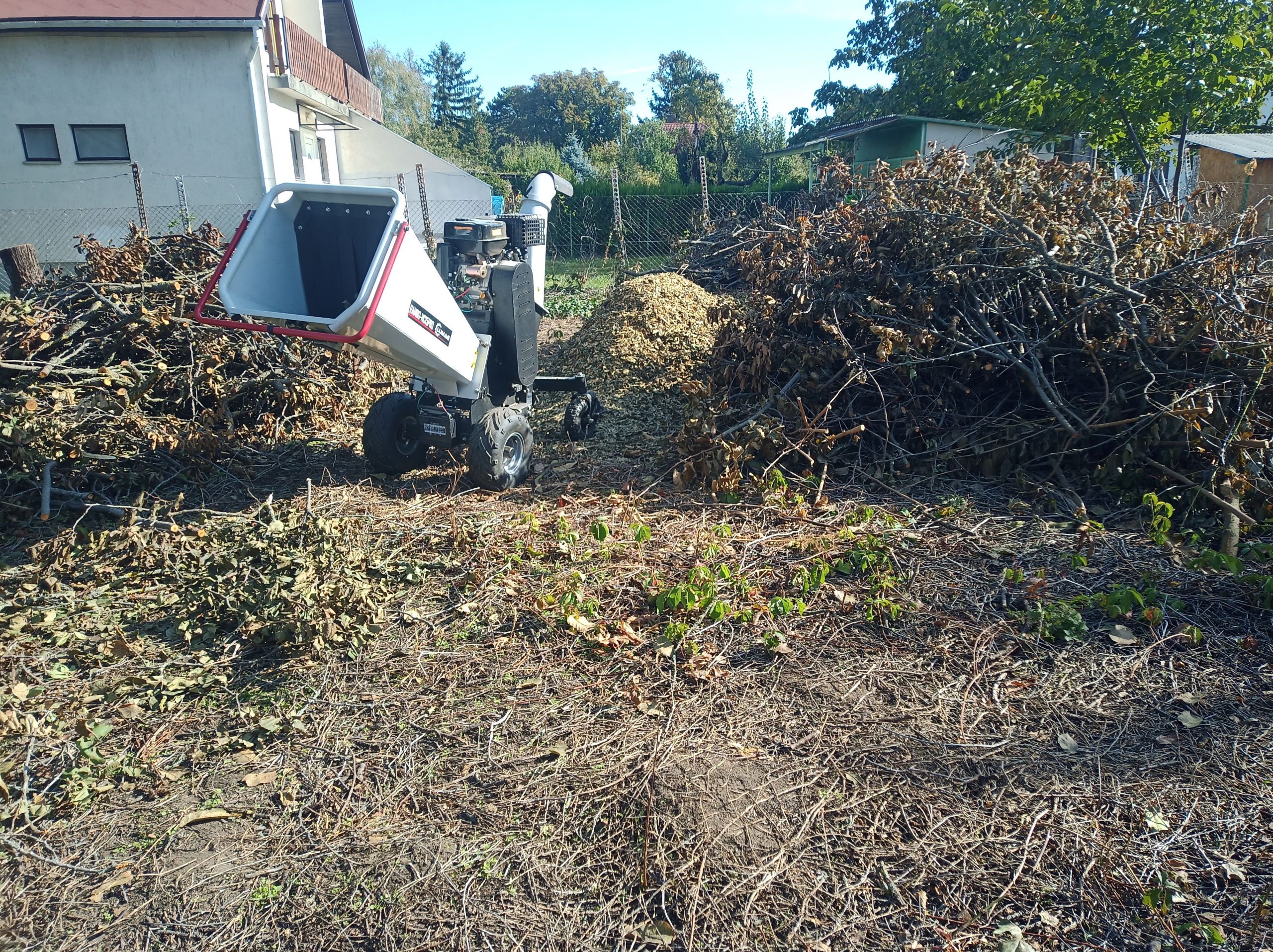 A kertben keletkező szervesanyag helyben való elégetését jelenleg jogszabály tiltja. A zöldhulladék kezelés talán egyik leggyakoribb módja, az ágdarálás. Az így keletkező zöld és fás részekből álló darálékot mulcsként, illetve komposzt alapanyagként tudjuk hasznosítani. Sokat gondolkodtunk, hogy milyen méretű és típusú ágdaráló illeszkedne leginkább a tevékenységi körünkbe. Tökéletes megoldás természetesen ebben sincs. Amelyik az egyik munkához pont megfelelő, a másikhoz túl kicsi, vagy éppenséggel túl nagy. Végül a Lumag Rambo HC15H típusú gépet választottuk. A mellette szóló legfontosabb érvek az állítható sebességű hidraulikus ágbehúzás, a széles etető garat, az ebben a kategóriában nagy, 15Le teljesítmény, és a viszonylag még könnyű mozgathatóság. Maximum 10-12cm átmérőjű ágak aprítására alkalmas. Elsősorban olyan munkákat vállalunk, amelynél az ágdarálás csak egy részfeladat és jól beilleszthető az egyéb tevékenységeink közé. Ilyen például a metszés, sövénynyírás, kiszáradt tuják eltávolítása, kertépítés előtti telektisztítás, kivágott fa ágainak a ledarálása. Mivel a munkavégzést rengeteg tényező befolyásolja, ezért árat mindig csak az adott munka felmérése után tudunk mondani. Legkönnyebben, a vízszintes területen, akadályoktól mentesen, könnyen megközelíthető, kis távolságra lévő, frissen levágott, tüske-, levél- és egyéb bomló szervesanyagtól mentes, szálirányba rendezett, közepes vastagságú, ágakat lehet darálni, de ilyen természetesen csak a mesében van! Az aprítás során, az ágak térfogata nagyjából tizedére csökken, így a szállítás is könnyebben megoldható. Az ilyen apríték, zöldhulladék lerakóban való leadásáért általában fizetni sem kell. Mielőtt belevágna, érdemes körülnézni, hogy az adott körülmények között, mi a leghatékonyabb megoldás!