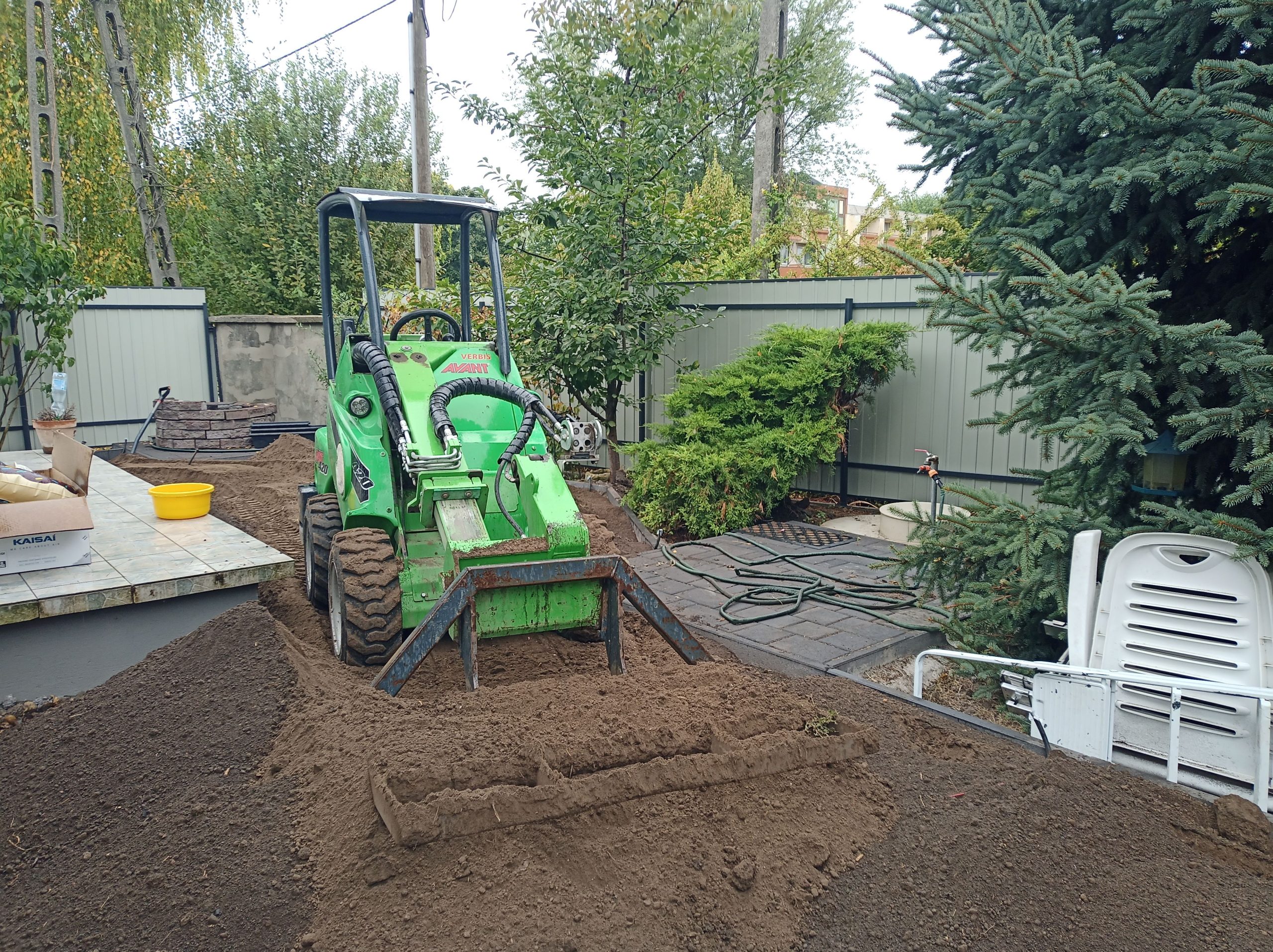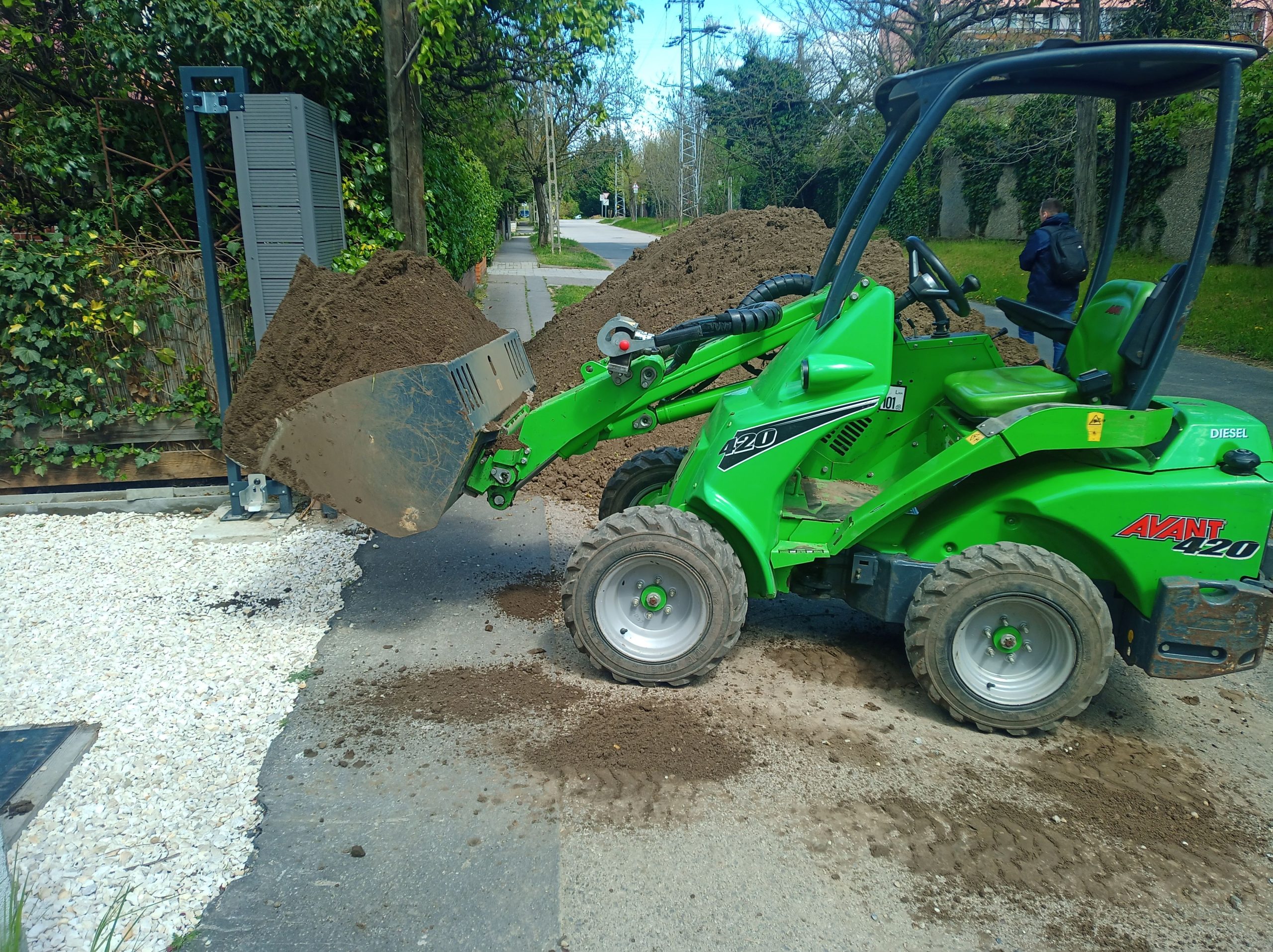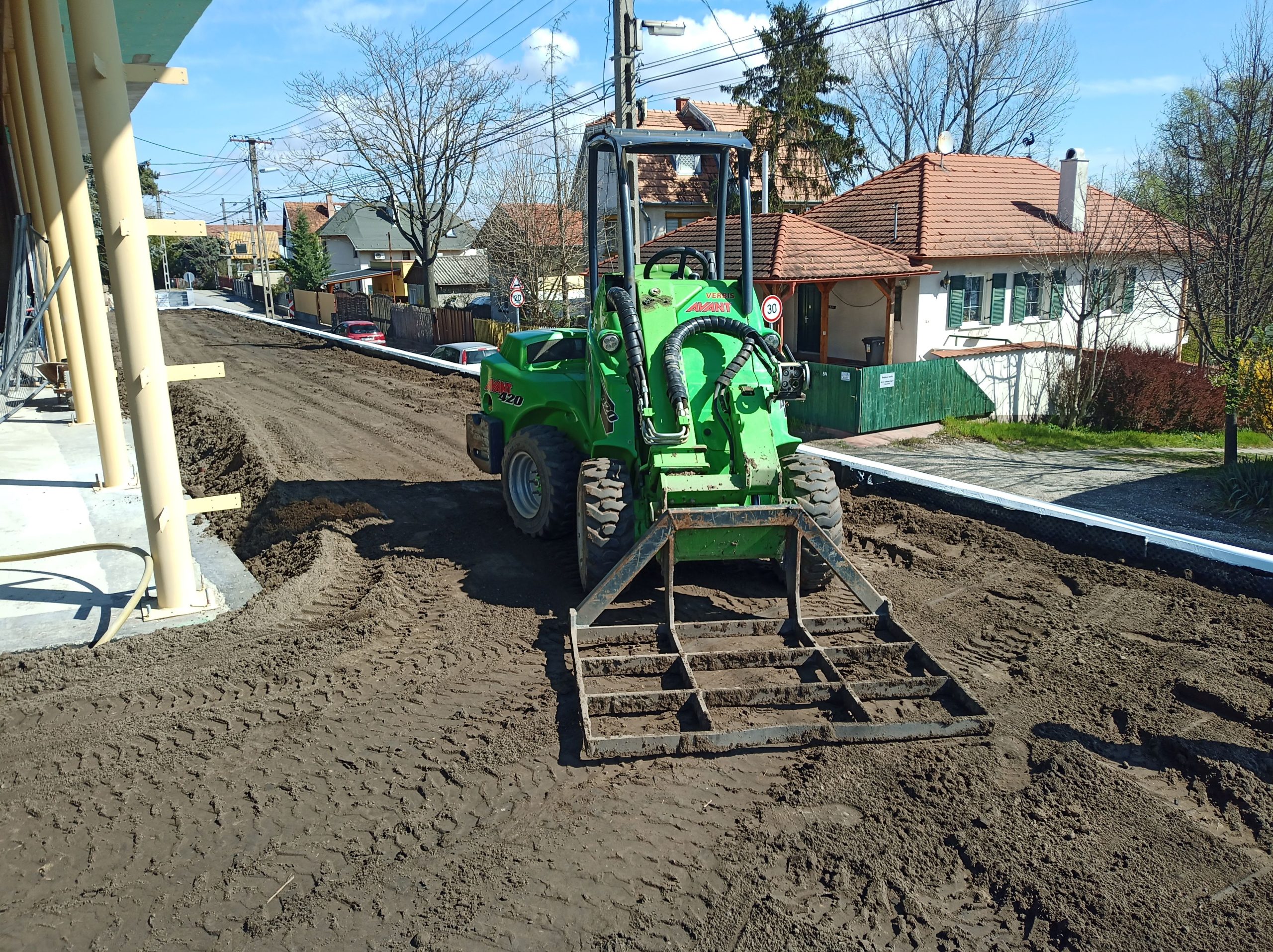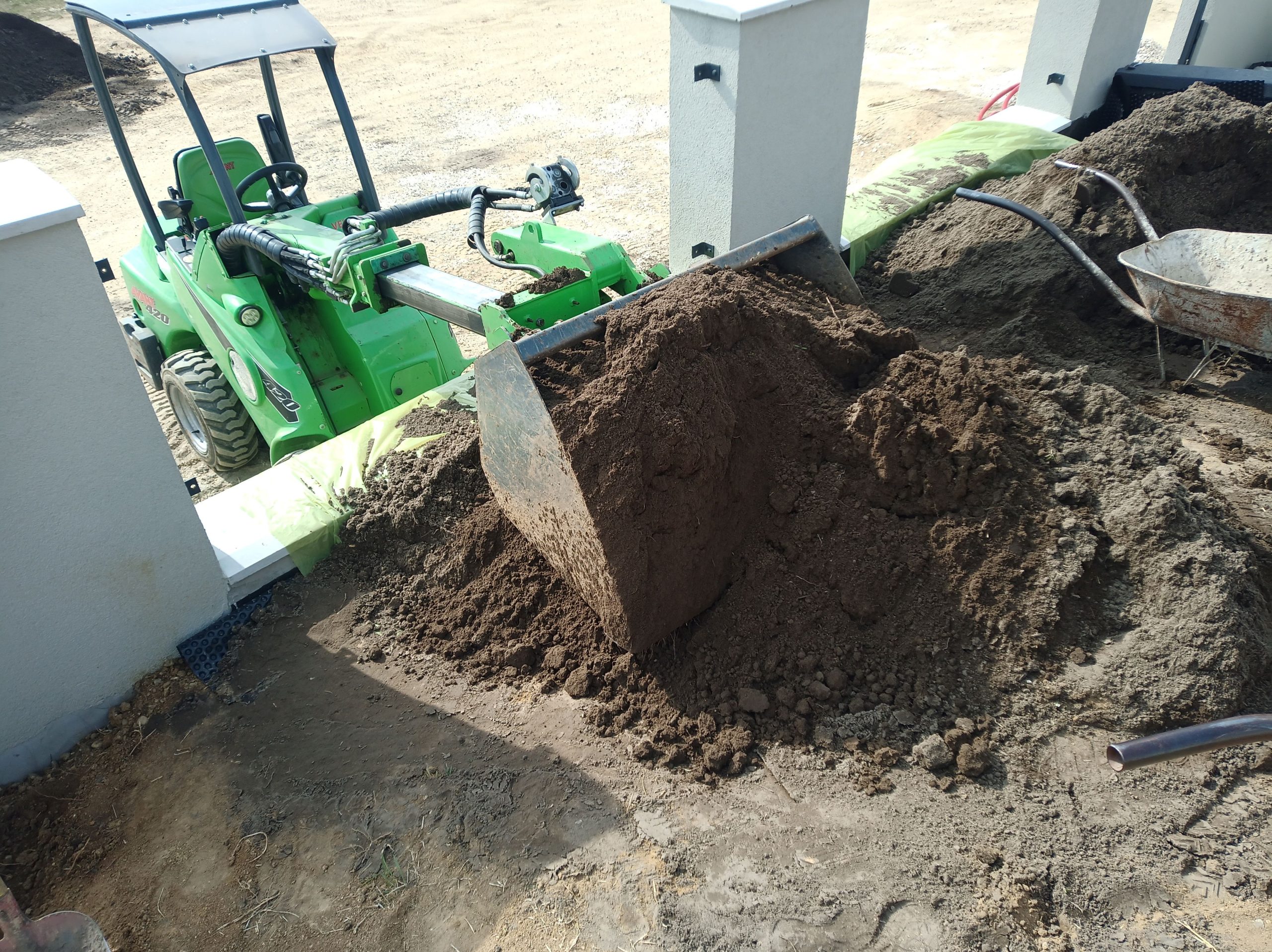 Talán az egyik legfontosabb művelet a kert kialakítása során. A legtöbb esetben nagy mennyiségű földet, murvát, sódert, kúlét és egyéb építési anyagot kell eljuttatni a rendeltetési helyére. A hagyományos „talicskázós módszernek” napjainkban már csak azokban az esetekben van létjogosultsága, ha semmilyen más módon nem oldható meg, amit tovább nehezítenek a domborzati viszonyok és a kertben elhelyezett tereptárgyak. Sok olyan esettel találkozok, amikor az anyagmozgatás hagyományos gépekkel már nem végezhető el. Ennek a leggyakoribb oka a nagy tömeg és a szűk átjutási keresztmetszet. A tömeg elsősorban a korábban elkészült, személyautó használatra kialakított térburkolaton való átjutásnál okoz problémát. A több tonnás, lánctalpas vagy csúszókormányzású gépek, melyek a korábbi munkafolyamatokban nélkülözhetetlenek voltak, kiszorulnak a területről. Az sem ritka, hogy a kert csak a kerítés lábazatán, egy ideiglenes, földből készült rámpán keresztül közelíthető meg, vagy a bedaruzás az egyedüli megoldás. A végleges terepszint kialakítása, a kerti szegélyek, térburkolatok, lépcsők, támfalak, szórófejek, kötésdobozok, kertvilágítás egyre inkább szűkítik a mozgásteret. A gép méretéből adódó előnyök leginkább itt érzékelhetőek. A tervezőmérnökök munkáját dicséri, hogy a gép kis mérete ellenére rendkívül jól terhelhető, emellett fordulékony és a kitolható gémnek köszönhetően az emelési magasság 2,7m.